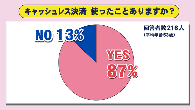 そのうち、キャッシュレス決済を使ったことがあるという人が87パーセント、使ったことがないという人が13パーセントでした。