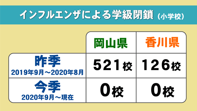 また、以下ようなデータもあります。例年この時期に増えてくるのがインフルエンザによる学級閉鎖。香川県によると、特に1月の最終週、がもっとも多くなるそうですが…今シーズンは岡山・香川ともに未だ0(ゼロ)なんです!