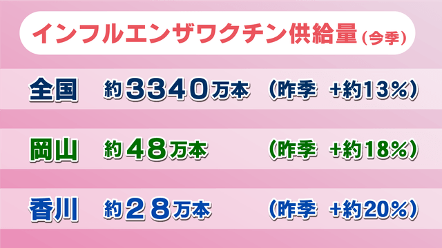 インフルエンザのワクチン供給量は今シーズン、今までで1番多かった昨シーズンより、約13パーセント多い量があるということです。
