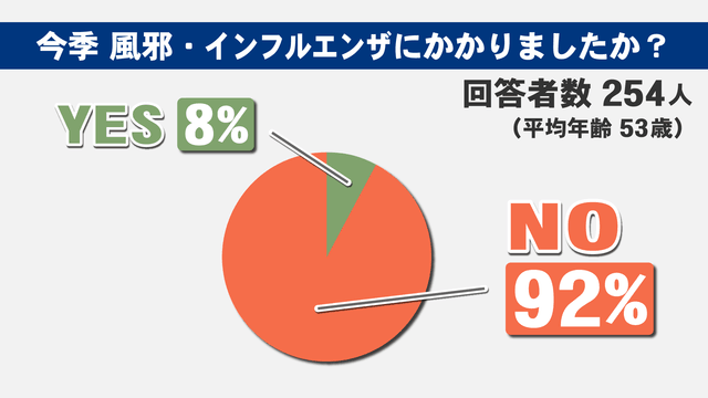 そのうち、風邪やインフルエンザにかかったと回答した人が8パーセント、かかっていないという人が92パーセントでした。
