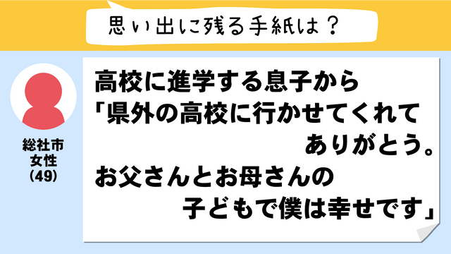 総社市の女性は高校に進学する息子さんからの初めての手紙で「県外の高校に行かせてくれてありがとう。お父さんとお母さんの子供で僕は幸せです」という感謝の手紙をもらったそうです。