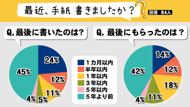 「最後に手紙を書いたのはいつですか?」、「最後に手紙を受け取ったのはいつですか?」という質問に対しては「5年より前」という回答が最も多く約半数でした。