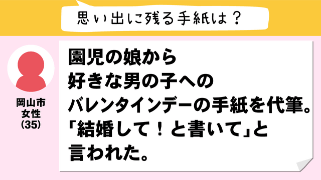 そして、岡山市の女性からは娘さんが好きな男の子へ送ったバレンタインデーの手紙で、字が書けない娘さんの代わりに手紙を書くため「何て書こうか?」と聞いたら「結婚して!」と言われて笑ってしまった、というかわいいエピソードが届きました。