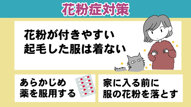 また、「あらかじめ薬を服用しておくこと」や「花粉が付きやすい起毛した服は着ないこと」、「家に入る前に服の花粉を落とすこと」が大切です。