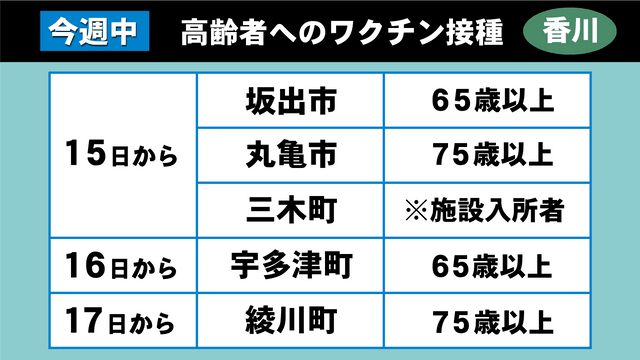 4月第3週は、15日から坂出市(65歳以上)、丸亀市(75歳以上)、三木町(施設入所者)の2市1町。16日から宇多津町(65歳以上)、17日から綾川町(75歳以上)です。
