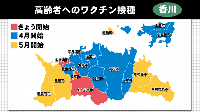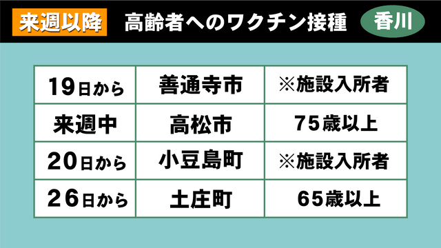 19日以降は、善通寺市、高松市(75歳以上)、小豆島町(施設入所者)、土庄町(65歳以上)と順番に接種が始まります。