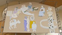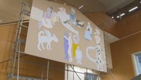 丸亀高校の生徒が複製した、猪熊弦一郎作の壁画「デモクラシー」