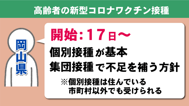 岡山県では5月17日から接種が始まります。県は病院などでの個別接種を基本とし、不足分を集団接種で補う方針を打ち出しています。岡山県では個別接種については、住んでいる市町村以外でも受けることができます。市町村によって対応はさまざまです。