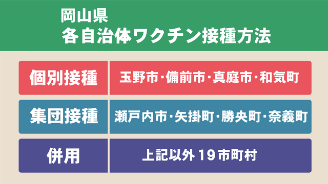 岡山県によりますと玉野市など4市町では個別接種のみ。瀬戸内市など4市町では集団接種のみ。その他19市町村が個別接種と集団接種の両方を行います。