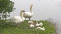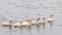 • 池をスイスイ泳ぐ7羽の白鳥のヒナと親鳥