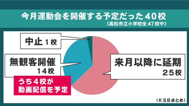KSBのまとめでは、高松市立の小学校47校のうち40校が5月に運動会を予定していました。このうち25校が「6月以降に延期」、14校が5月に「無観客」で開催します。