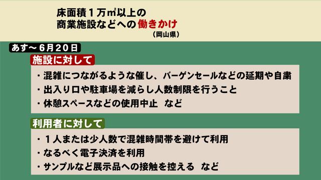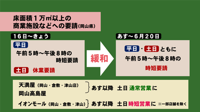 方針を受けて、県内の天満屋各店は6月から土日の通常営業を再開すると発表しました。県内のイオンモールも、専門店街とレストランで基本的に土日は午後8時までの時短営業を行います。