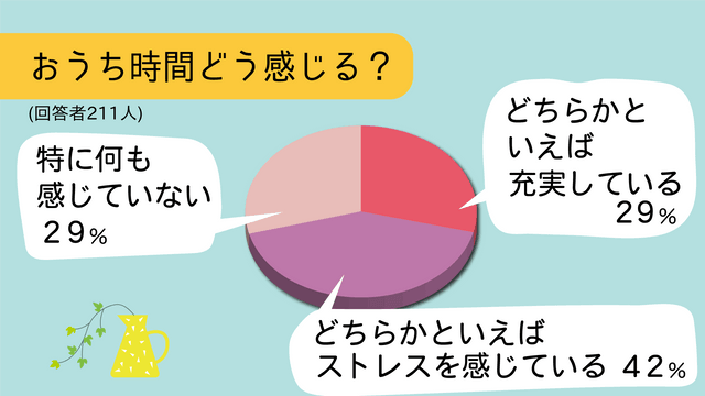おうち時間が増えたことで「家族との会話が増えた」「部屋が片付いた」という人がいる一方、「新型コロナで孫が来なくなってさみしい」や「夫が自宅勤務になり家事の手間が増えた」などの意見があり、約4割の人がなんらかのストレスを感じているようです。