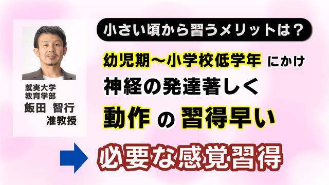 子どものスポーツ学に詳しい就実大学教育学部の飯田准教授は幼児期~小学校低学年にかけては、神経の発達が著しく動作の習得が早いということで、小さい頃から習うことでスポーツに必要な感覚を習得しやすいとしています。