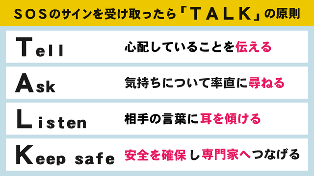 香川大学の太田先生によりますと、子どもからSOSのサインを受け取ったときには「TALK」の原則で対応してほしいということです。