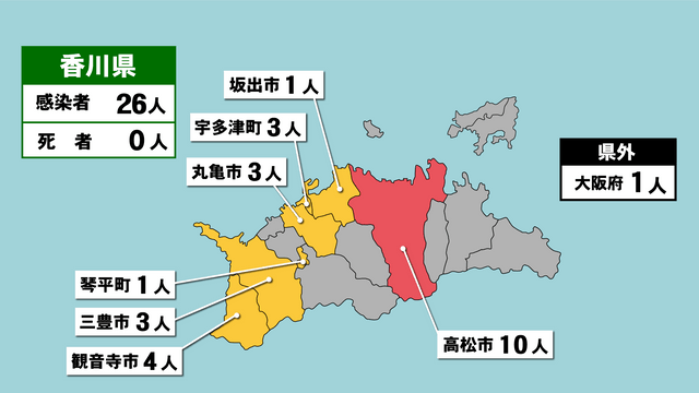 香川県と高松市によりますと、新たに感染が確認されたのは10歳未満から60代までの男女で、高松市で10人、観音寺市で4人など合わせて26人です。このうち2人が中等症です。