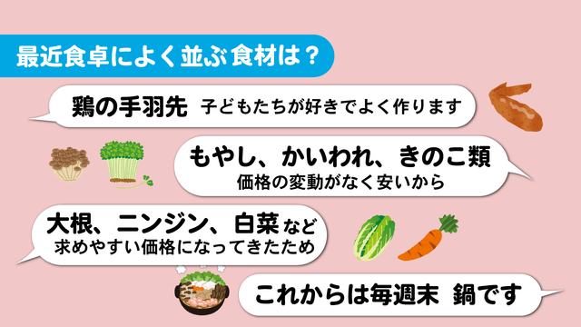アンケートでは「最近食卓によく並ぶ食材」についても聞いてみました。その結果、「子どもたちが好き」ということで「鶏の手羽先」をあげる方や、「最近求めやすい価格になった」などの理由で野菜をよく買うという声もありました。中には「これからは毎週末、鍋です」といった回答もありました。