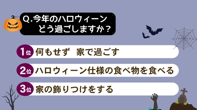 アンケートの結果は「何もせず自宅で過ごす」という回答が最も多く、「ハロウィーン仕様の食べ物を食べる」、「家の飾りつけをする」と続いています。