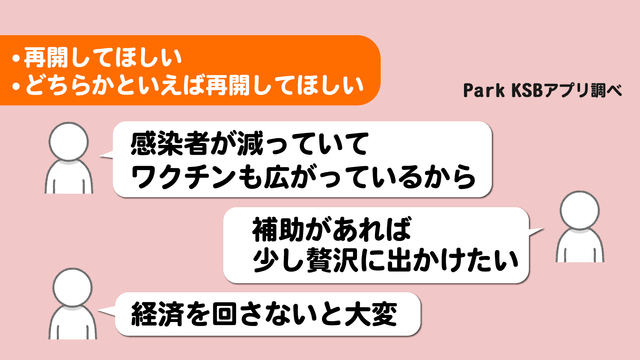 再開してほしい理由としては、「ワクチン接種が広がっていること」や、経済を回していく必要があるなどがありました。