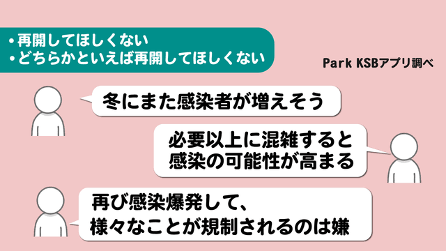 一方、反対側の意見としては「冬にまた感染者が増えそう」「感染爆発によってまたさまざまなことを規制されるのは嫌」などがありました。