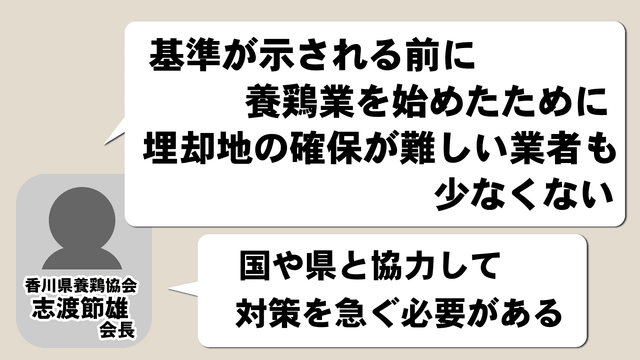 香川県養鶏協会の志渡節雄会長は「基準が示される前に養鶏業を始めたために、埋却地の確保が難しい業者も少なくない。国や県と協力して対策を急ぐ必要がある」とコメントしています。