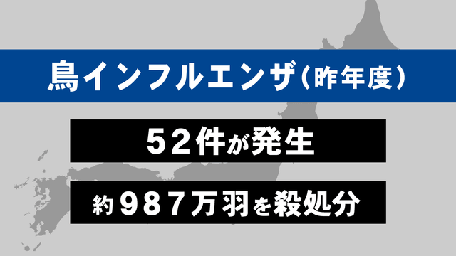 昨年度、全国の養鶏場では鳥インフルエンザが52件が発生し、過去最悪の約987万羽が殺処分されました。