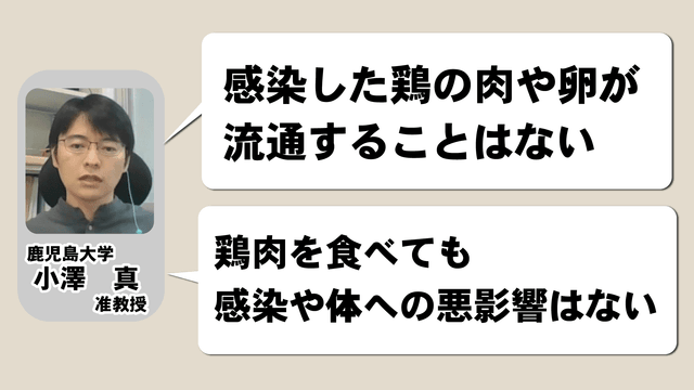 小澤准教授は「鳥インフルエンザに感染した鳥の鶏肉や卵が食卓に上ることはない。鶏肉を食べることによる感染や体への悪影響はない」と消費者には冷静な対応を求めています。