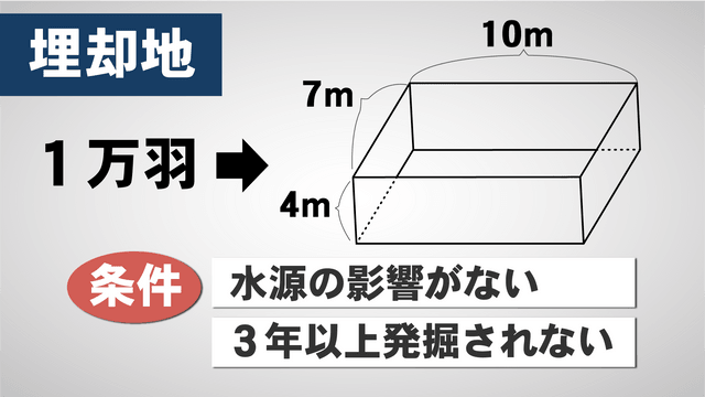 国の基準では1万羽を埋める場合、縦7m・横10m・深さ4mの広さが必要だとしています。