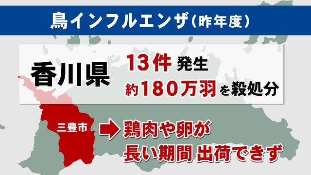 このうち香川県では去年11月から12月にかけて三豊市を中心に合わせて13件が発生し約180万羽を殺処分。発生が集中したエリアでは鶏肉や卵が出荷できない状態が長く続きました。