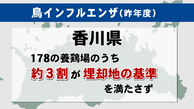 国は殺処分したニワトリは原則として現地または近くで埋却するよう求めていますが、香川県によると県内178の養鶏場のうち3割ほどが「埋却地としての基準」を満たしていません。