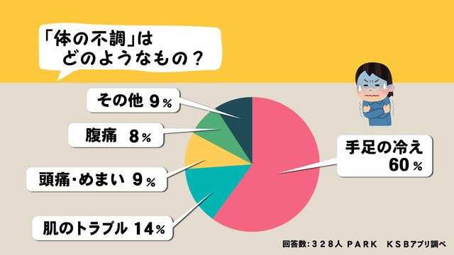 体の不調と答えた方のうち約6割の人が「手足の冷え」に悩んでいると答えています。