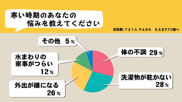 寒い時期の悩みについては「体の不調」「洗濯物が乾かない」などの声が聞かれました。