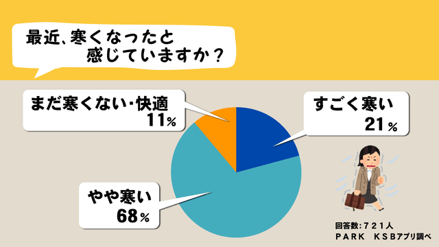 パークKSBアプリでアンケートしたところ、「最近寒くなったと感じていますか?」という問いに、「やや寒くなった」「すごく寒くなった」という回答が全体の約9割を占めています。多くの人が最近、寒くなったと感じているようです。