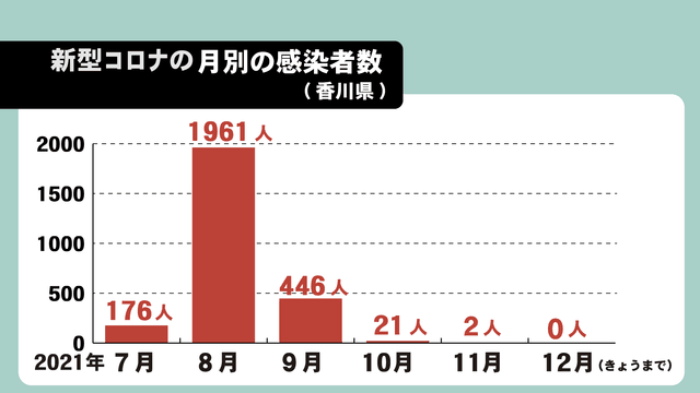 香川県で発表された新規感染者の数を月ごとにまとめたデータでは、2021年8月には約2000人でしたが、その後、大きく数が減り10月は21人、11月は2人でした。こうした状況からか、週末の観光地や繁華街では人出が増えてきています。