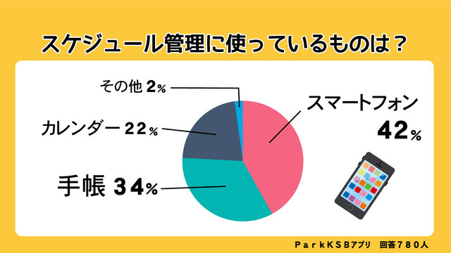 パークKSBアプリのアンケートでスケジュールの管理に主に何を使っているか尋ねたところ、「スマートフォン」という人が最も多く、次いで「手帳」、「カレンダー」となりました。「目が届くところに付箋を貼る」や「記憶力」という人もいました。