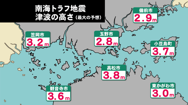 南海トラフ地震が発生した場合、岡山・香川の各地で想定されている最大の津波の高さをみてみると、最も高いのは高松市の3.8メートルです。岡山県では笠岡市や倉敷市で3.2メートルと予想されています。