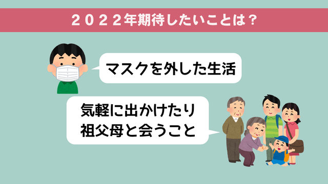 2022年に期待したいことについては「マスクを外した生活」や「気軽に出かけたり祖父母に会うこと」など、新型コロナ収束を願うものが多く寄せられました。