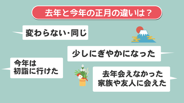 「去年の正月」と「今年の正月」の違いについては「変わらない・同じ」という人も多かったのですが、「少しにぎやかになった」「今年は初詣に行けた」「去年は会えなかった家族や友人に会えた」などの声も聞かれました。
