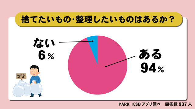 パークKSBアプリで「捨てたいもの・整理したいものはあるか」を尋ねたところ、90%以上の人が「ある」と答えました。