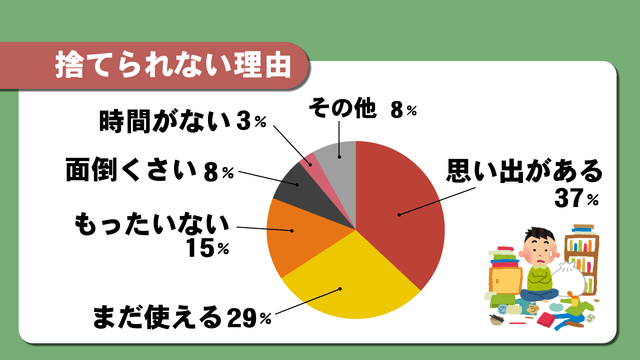 一方、捨てたくてもなかなか捨てられない理由としては「まだ使える」「もったいない」などもある中で、「思い出がある」が最も多くなりました。