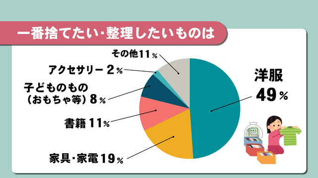 一番捨てたい・整理したいものには半数近い人が「服」をあげました。次いで「家具・家電」という結果になりました。