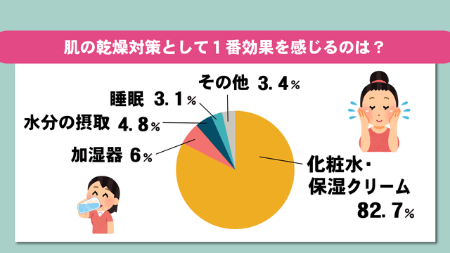 次は「肌の乾燥対策として一番効果を感じているのは?」と尋ねたところ、82.7%あまりの人が「化粧水や保湿クリーム」と答えました。「一番効果を感じているのは?」と尋ねた結果なので、実際には多くの人が加湿器も使いながら化粧水なども使っているのではないでしょうか? 回答してくれた方の中には乾燥対策として「白湯を飲んでマッサージする」や「室内に洗濯ものを干す」という方もいました。