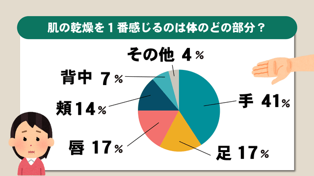 続いて、肌の乾燥を一番感じるのは体のどの部分かを尋ねたところ、最も回答が多かったのは「手」41%、続いて「くちびる」17%と「足」17%でした。コロナ禍でマスクをしているので口元は保湿されている気がしていましたが「くちびる」の乾燥が気になる方も多いようです。