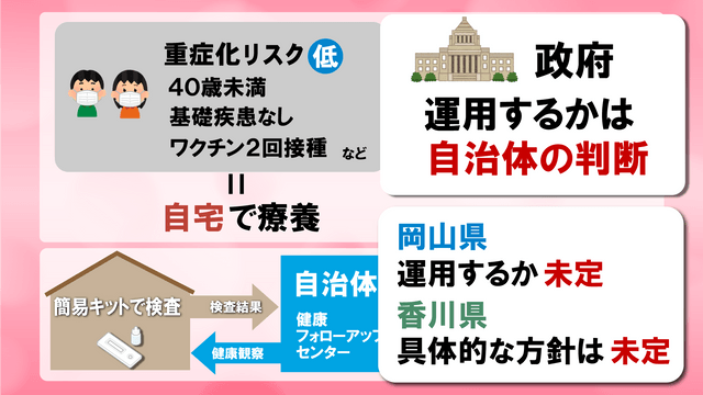 簡易キットなどで検査を行い、陽性であれば自治体に連絡し自治体の健康観察などを受けることになりますが、こうしたケースを実際に運用するかどうかは各自治体の判断としています。岡山県は「運用するかは未定」、香川県は「具体的な方針は未定」としています。