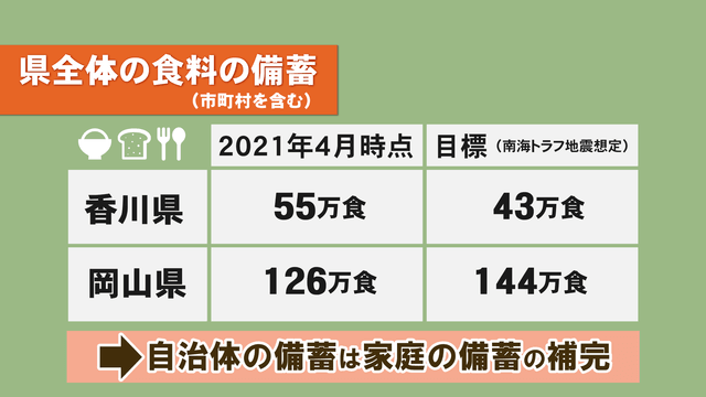 市町村も含めた県全体の食料の備蓄は、2021年4月時点で香川県は「55万食」、岡山県は「126万食」です。