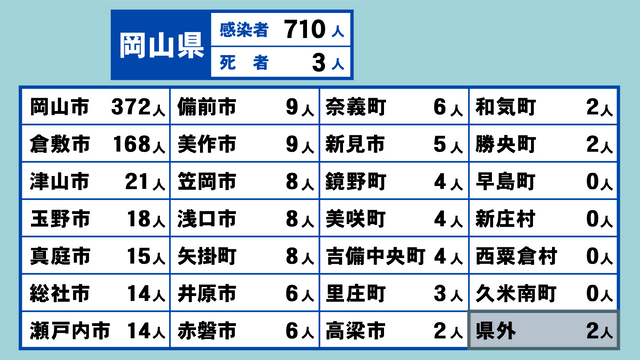 岡山県では岡山市で372人、倉敷市で168人など、合わせて710人の感染と感染者3人の死亡が発表されました。高齢者福祉施設や学校、保育施設などで、合わせて7件のクラスターが新たに発生しました。