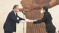 贈呈式に出席した小松原美里選手(備前市役所 23日)