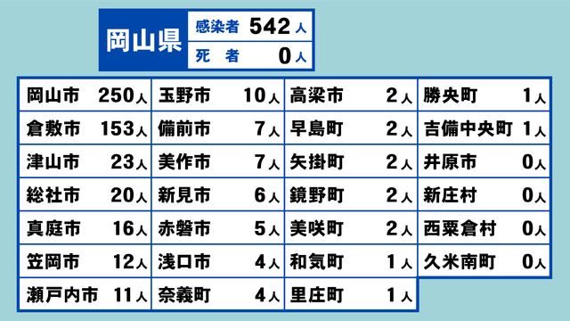 岡山県では、岡山市で250人、倉敷市で153人、津山市で23人、総社市で20人など合わせて542人の新規感染が判明しました。