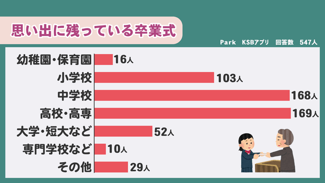 パークKSBアプリで「最も思い出に残っている卒業式」を尋ねたところ、一番多かったのは「高校や高専」。次いで「中学校」。そして「小学校」となりました。