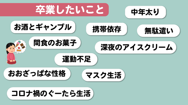 最後に皆さんが今卒業したいことを聞くと、「お酒とギャンブル」「携帯依存」「中年太り」「深夜のアイスクリーム」などを挙げてくれました。さらに、「コロナ禍のぐーたら生活」「マスク」などを挙げる人もいました。